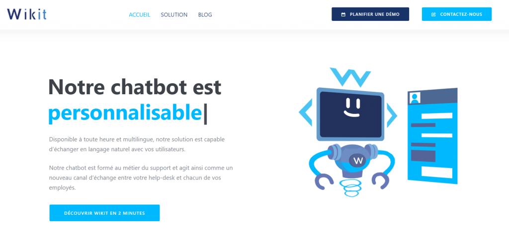 WIKIT Design et animation de Wiktor le chatbot, mascotte de l’entreprise Wikit qui développede l’IA conversationnelle à l’occasion de la refonte globale de leur site. 2019 – Tous droits réservés à Wikit Revenir à la page d'accueil